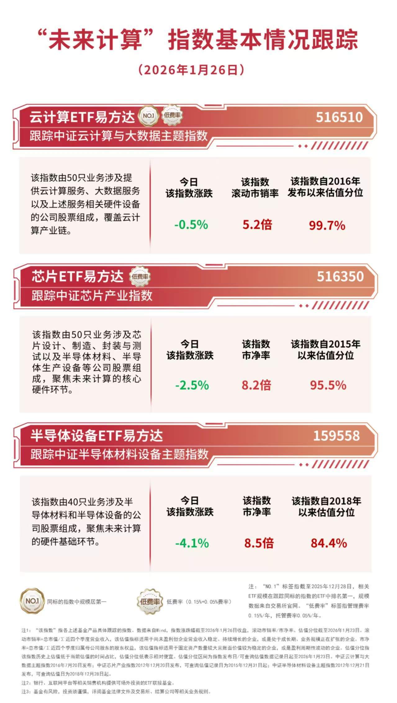 1月26日,半导体设备板块低开低走,截至收盘,中证云计算与大数据主题指数下跌0.5%,中证芯片产业指数下跌2.5%,中证半导体材料设备主题指数下跌4.1%。资金逆势布局,半导体设备ETF易方达(159558)全天净申购达2000万份。