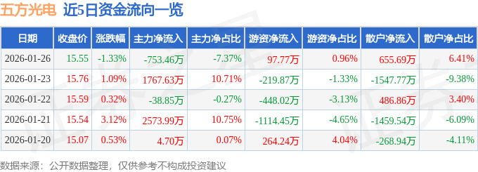 证券之星消息,截至2026年1月26日收盘,五方光电(002962)报收于15.55元,下跌1.33%,换手率3.14%,成交量6.57万手,成交额1.02亿元。