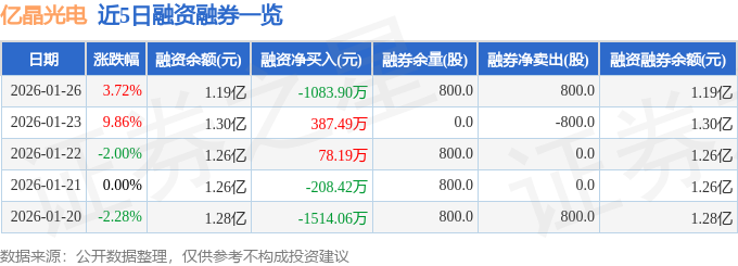 亿晶光电融资融券信息显示,融资方面,当日融资买入695.25万元,融资偿还1779.15万元,融资净偿还1083.9万元。融券方面,融券卖出800.0股,融券偿还0.0股,融券余量800.0股,融券余额0.27万元。融资融券余额1.19亿元。