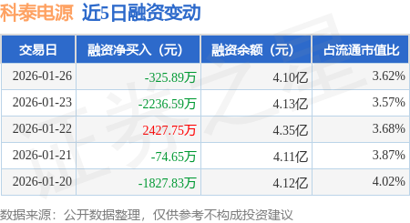 证券之星消息,1月26日,科泰电源(300153)融资买入6575.29万元,融资偿还6901.18万元,融资净卖出325.89万元,融资余额4.1亿元。