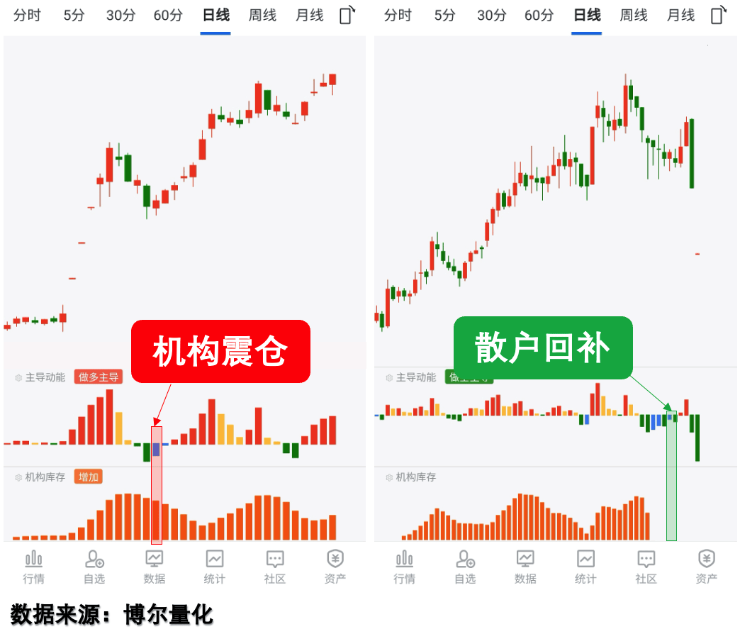 看图2,左边的股票在震荡过程中,「机构库存」保持活跃的同时出现了空头回补迹象,这就是典型的「机构震仓」行为——机构故意砸盘制造恐慌情绪,等散户纷纷卖出后再重新入场捡筹码;而右边的股票,虽然也有空头回补行为,但没有「机构库存」配合,说明只是短线资金的短暂入场,根本没有机构长期参与的意愿,后续走势自然持续走弱。