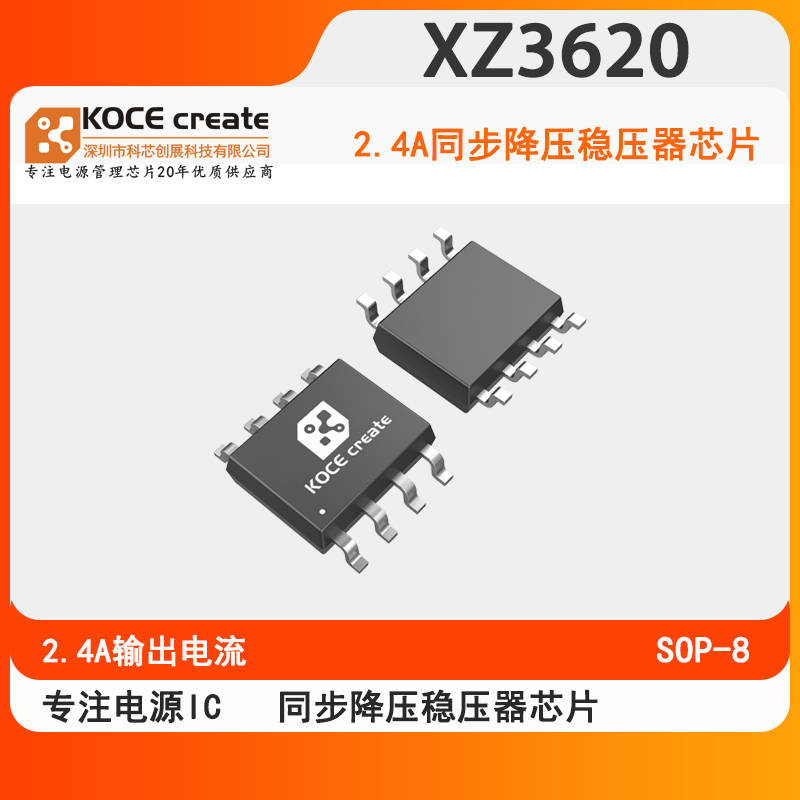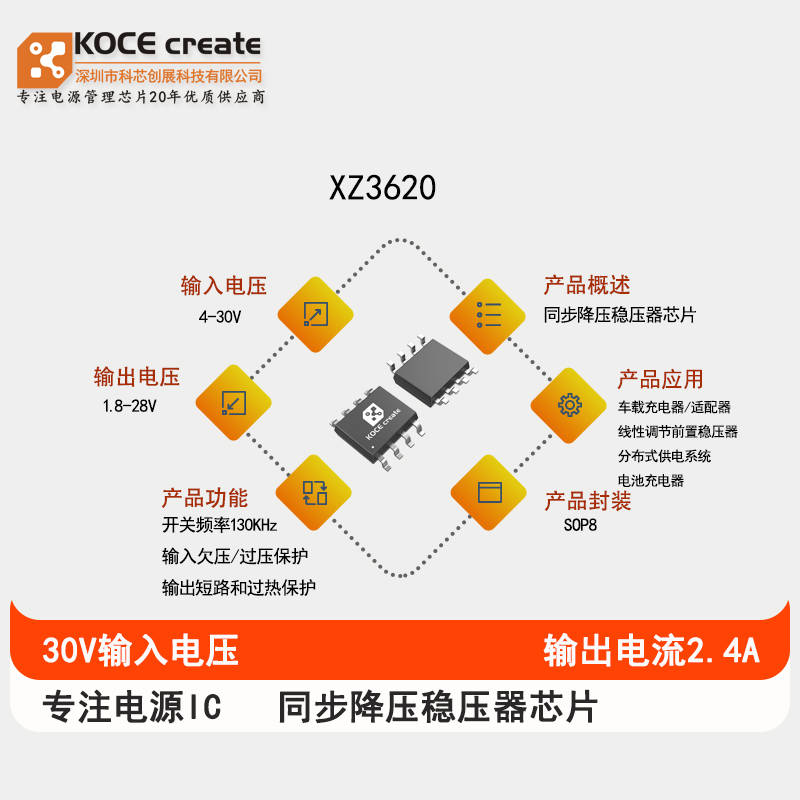 XZ3620是支持高电压输入的同步降压电源管理芯片,在4-30V的宽输入电压范围内可实现2.4A的连续电流输出。