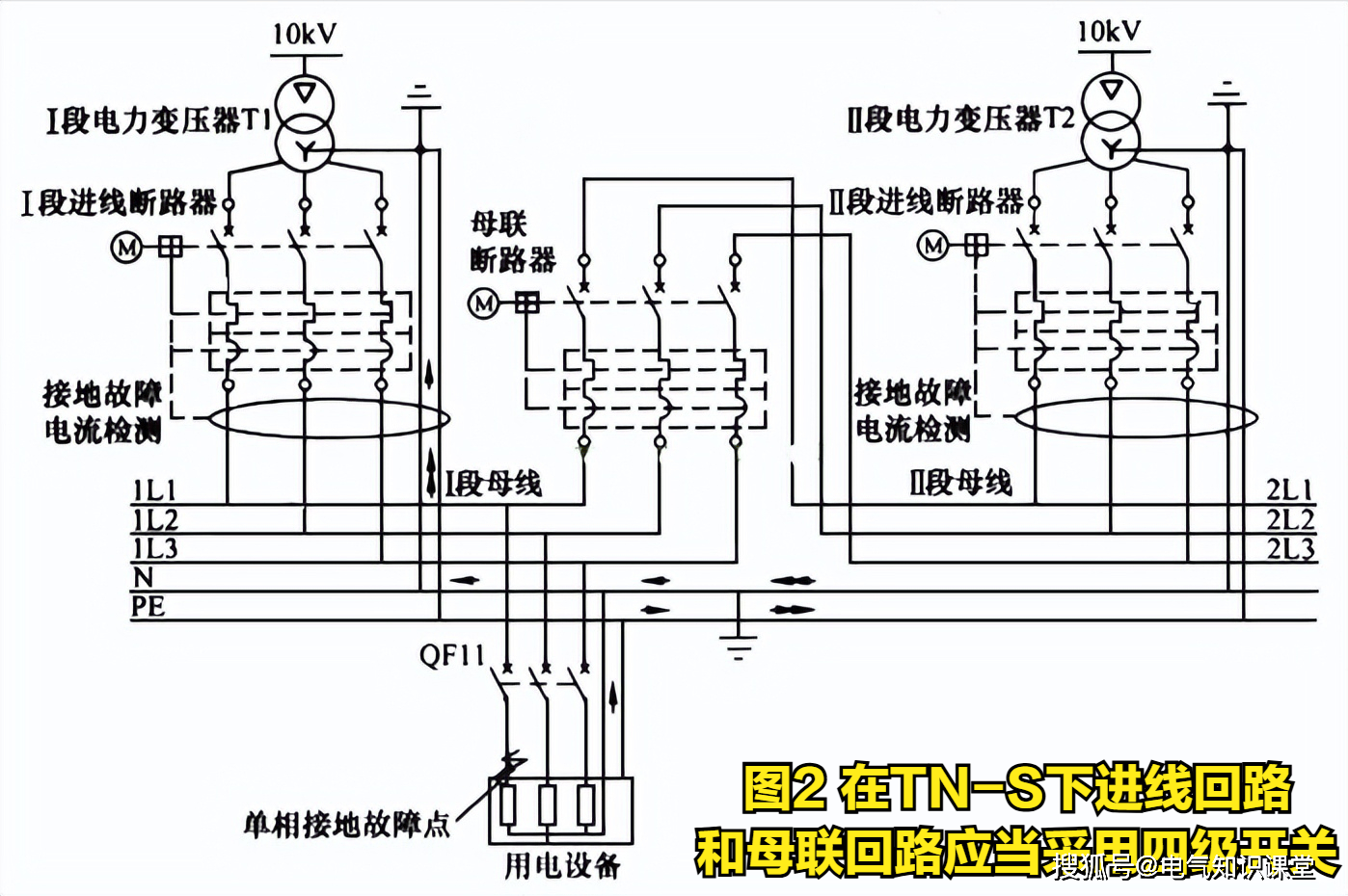 当Ⅰ母线上的用电设备发生单相接地故障时,我们看到正确的路径是:用电设备外壳→PE线→PE线和N线的结合点→Ⅰ段N线→Ⅰ段接地故障电流检测→Ⅰ段变压器。这条路径是正确的。