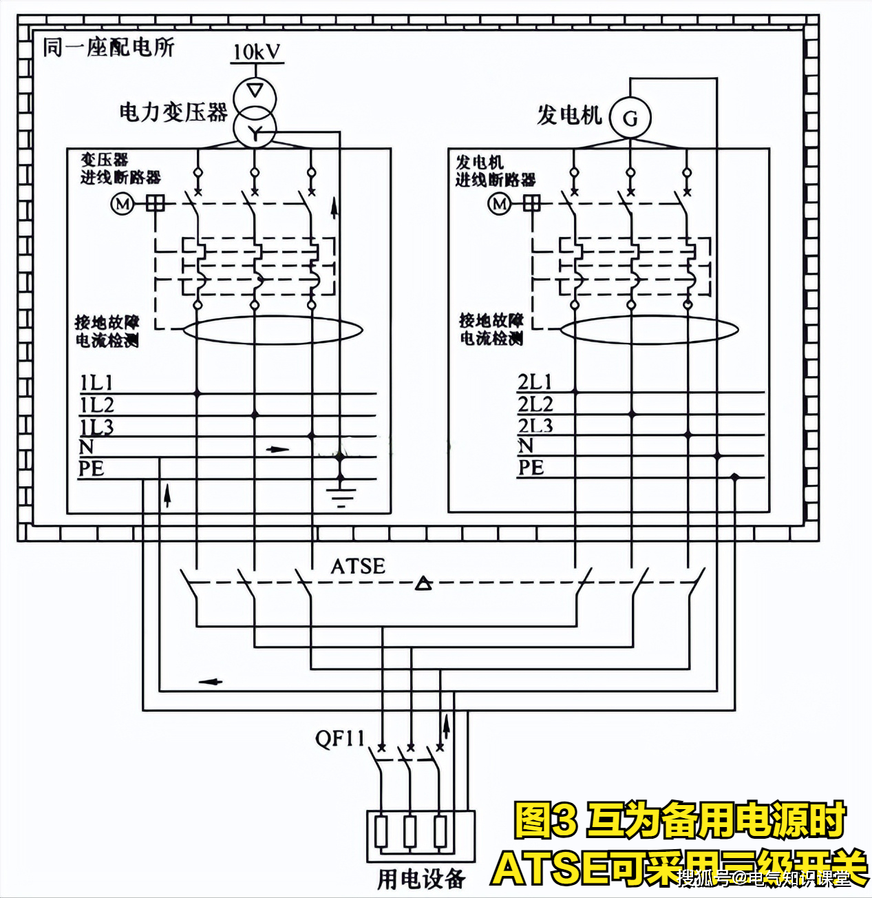 3、两套电源同处一室(共地),但不共用低压配电柜,则二级配电设备中的电源转换开关可采用三极开关,如图3所示。