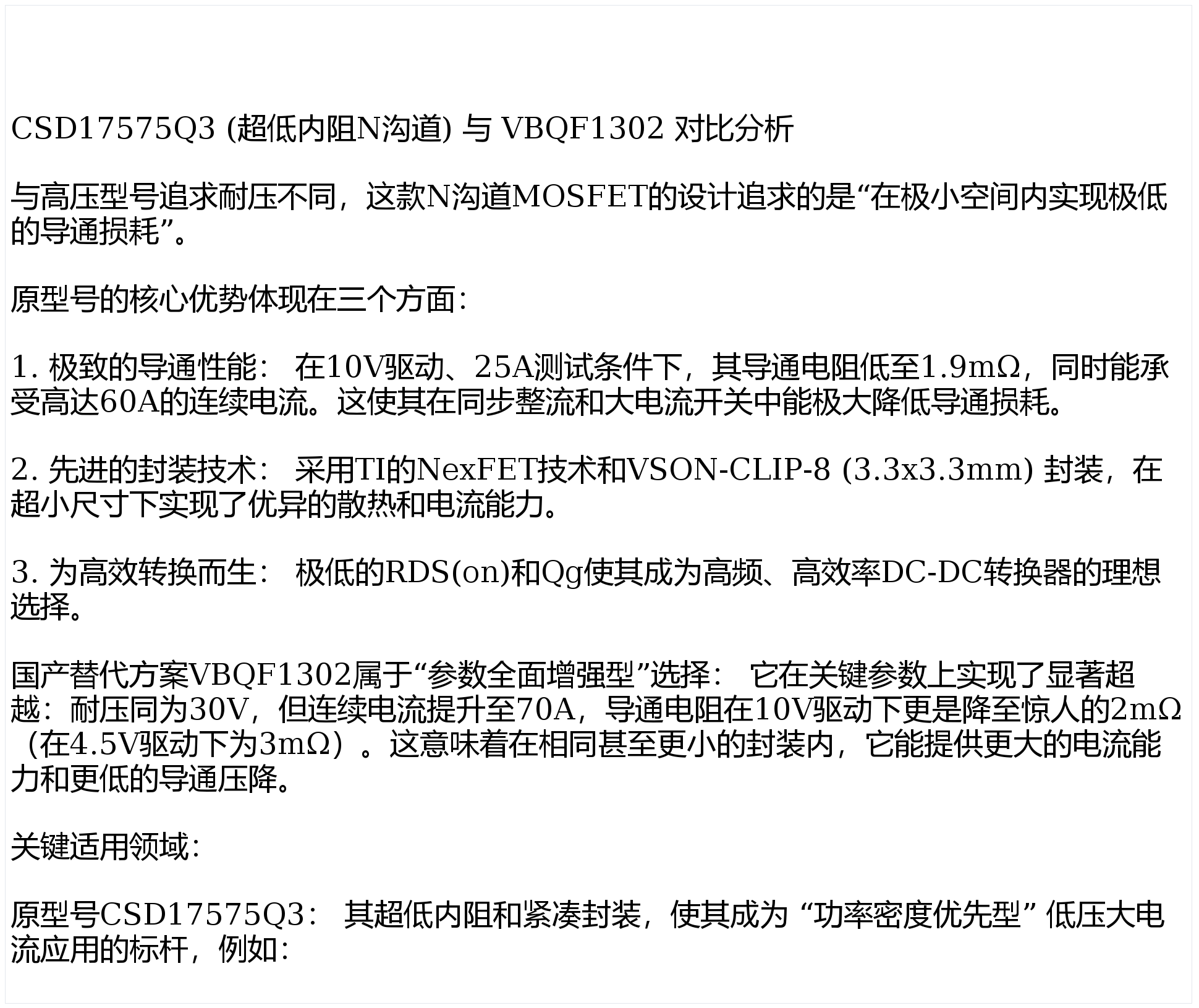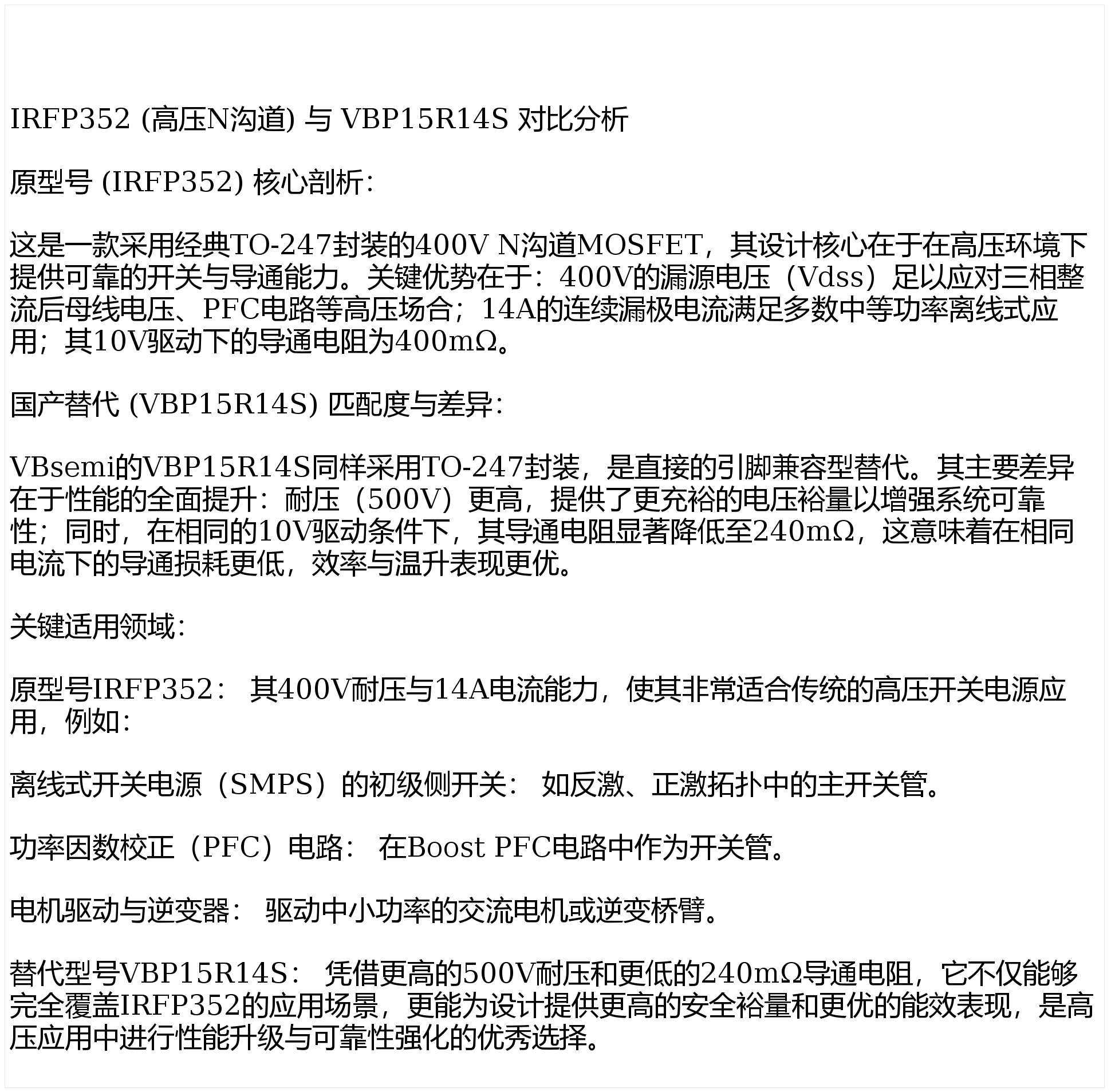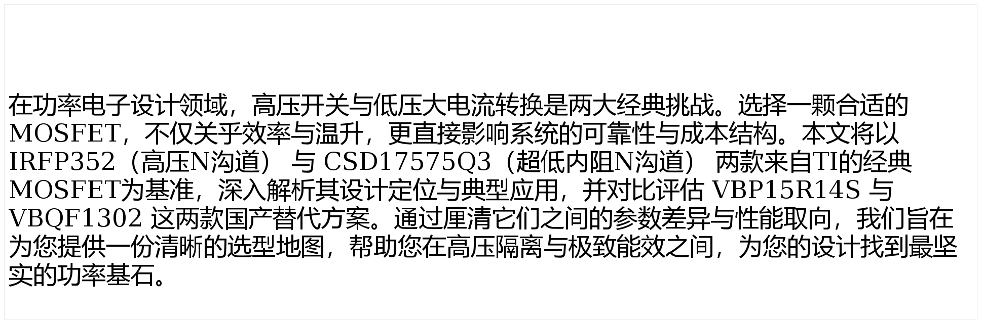 高压大电流与超低内阻的博弈:IRFP352与CSD17575Q3对比国产替代型号VBP15R14S和VBQF1302的选型应用解析