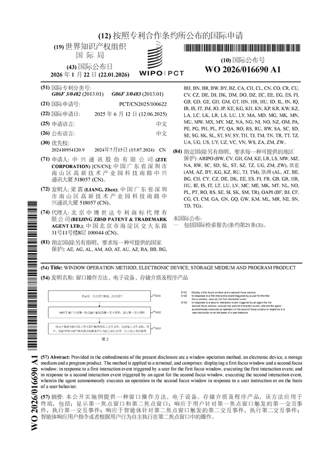 证券之星消息,根据企查查数据显示中兴通讯(000063)公布了一项国际专利申请,专利名为“窗口操作方法、电子设备、存储介质及程序产品”,专利申请号为PCT/CN2025/100622,国际公布日为2026年1月22日。