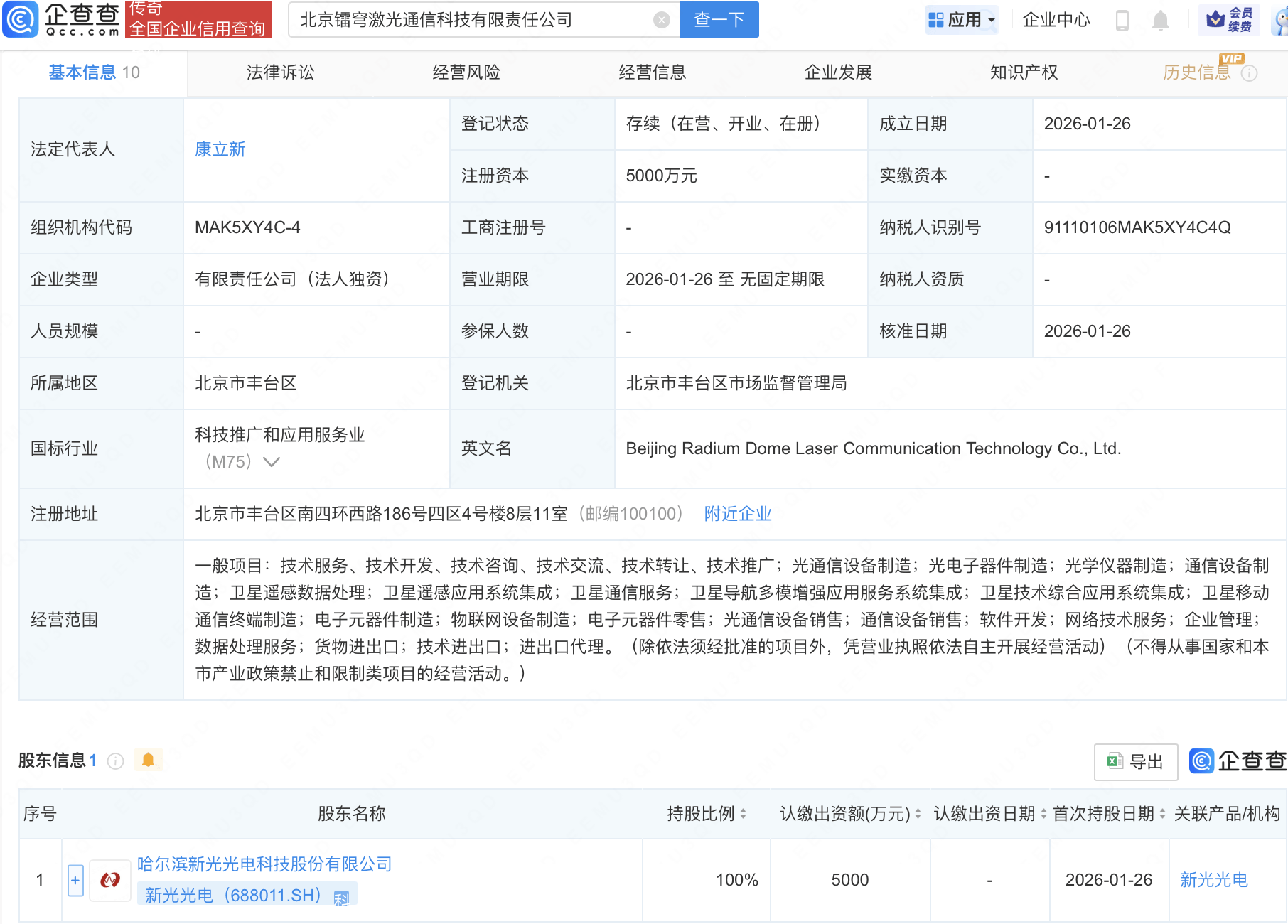 企查查APP显示,近日,北京镭穹激光通信科技有限责任公司成立,注册资本5000万元,经营范围包含:卫星遥感应用系统集成;卫星通信服务;卫星导航多模增强应用服务系统集成;卫星技术综合应用系统集成;卫星移动通信终端制造等。企查查股权穿透显示,该公司由新光光电(688011)全资持股。