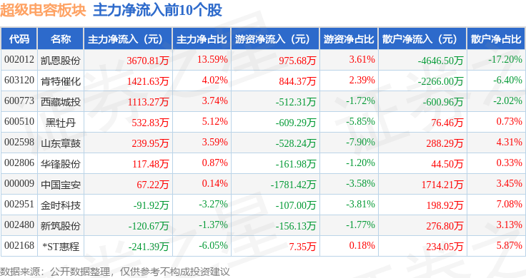 从资金流向上来看,当日超级电容板块主力资金净流出21.66亿元,游资资金净流入8.29亿元,散户资金净流入13.37亿元。超级电容板块个股资金流向见下表: