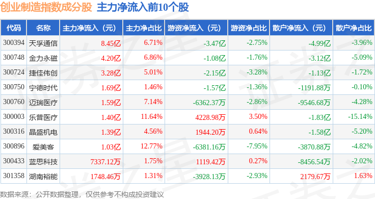 资金流向方面,创业制造(399261)指数成份股当日主力资金净流出合计67.1亿元,游资资金净流入合计7.69亿元,散户资金净流入合计59.41亿元。成份股资金流向详情见下表: