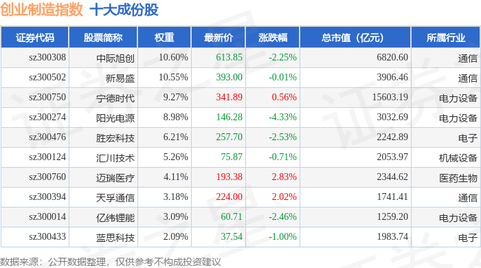 创业制造(399261)指数十大成份股详情如下: