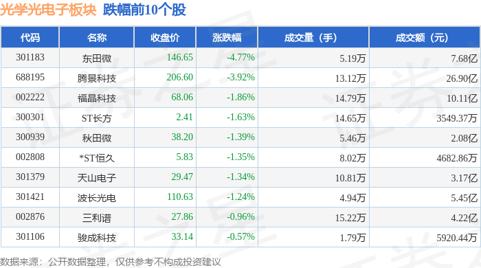 证券之星消息,1月23日光学光电子板块较上一交易日上涨3.08%,乾照光电领涨。当日上证指数报收于4136.16,上涨0.33%。深证成指报收于14439.66,上涨0.79%。光学光电子板块个股涨跌见下表: