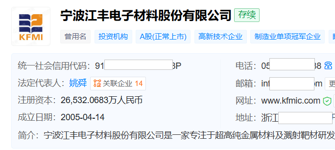 天眼查显示,江丰电子成立于2005年4月,位于浙江省余姚市,2017年6月在深交所创业板上市,是一家专注于超高纯金属材料及溅射靶材研发生产的企业,核心业务涵盖半导体用超高纯金属溅射靶材、液晶平板显示器用高纯金属溅射靶材以及半导体用精密零部件的研发、制造与销售。