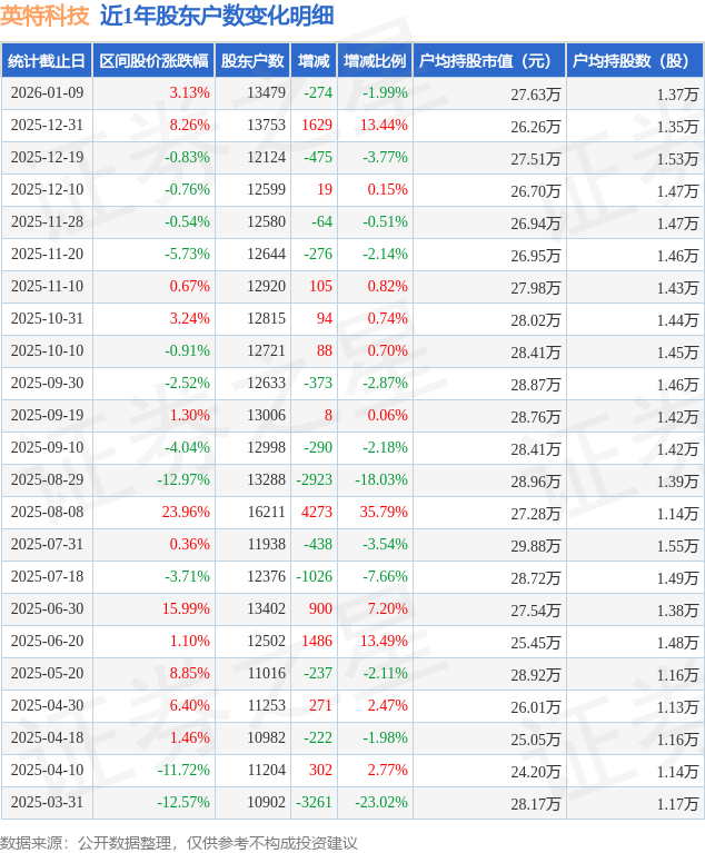 证券之星消息,近日英特科技披露,截至2026年1月9日公司股东户数为1.35万户,较12月31日减少274.0户,减幅为1.99%。户均持股数量由上期的1.35万股增加至1.37万股,户均持股市值为27.63万元。