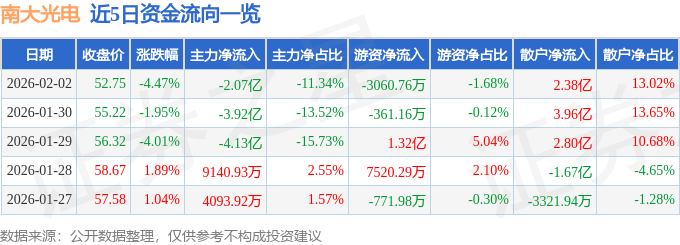 证券之星消息,截至2026年2月2日收盘,南大光电(300346)报收于52.75元,下跌4.47%,换手率5.19%,成交量34.04万手,成交额18.27亿元。