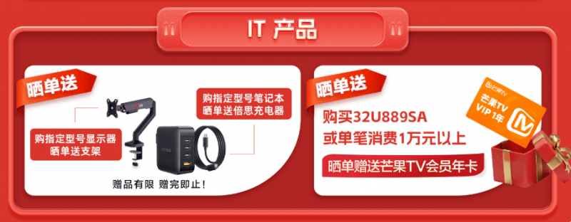 此外,购买显示器32U889SA型号或任意IT产品单笔消费满1万元以上,并晒单评价的顾客,还将额外获得芒果TV会员年卡一张(该活动不与前两项晒单活动同享)。赠品数量有限,机会不容错过。