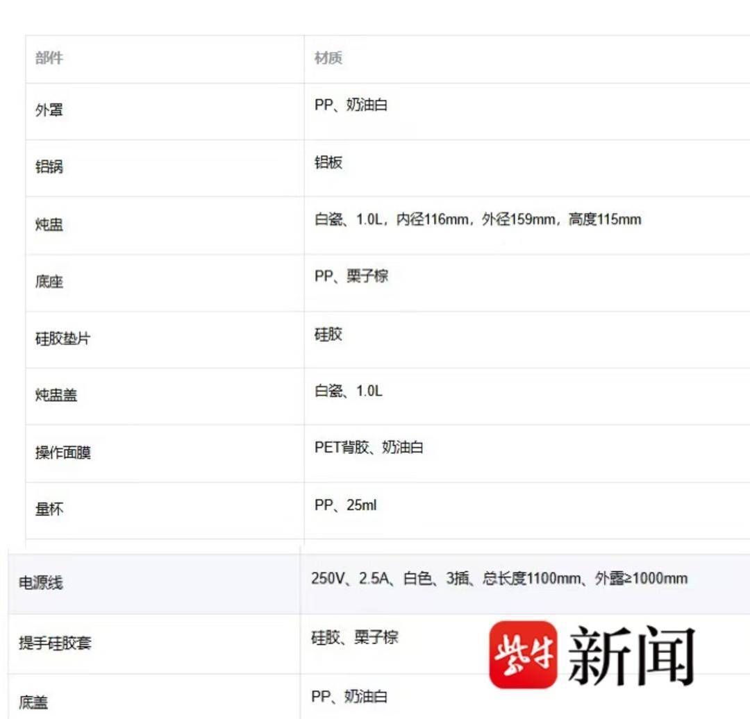 记者随后找到一家仍在售卖该款产品的店铺,其宣传图及详情文案中,标注了“0塑料选材”“安全炖煮无塑料味”等字样。记者向该店客服咨询产品材质,对方回复为“白瓷内胆,内锅精选金属材质,安全炖煮无塑料味,与水接触皆为食品级材质。”针对外壳材质,客服发来的截图显示,产品外罩为奶油白PP材质、底座为栗子棕PP材质、底盖为奶油白PP材质。据了解,PP材质是聚丙烯,是目前所有塑料中最轻的品种之一。