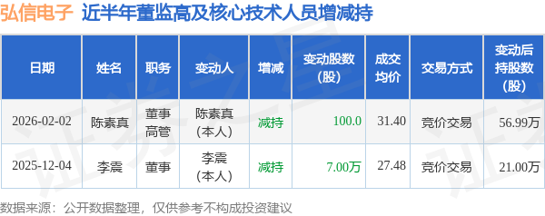 证券之星消息,根据2月3日市场公开信息、上市公司公告及交易所披露数据整理,弘信电子(300657)最新董监高及相关人员股份变动情况:2026年2月2日公司董事,高管陈素真共减持公司股份100.0股,占公司总股本为0.0001%。变动期间公司股价下跌1.25%,2月2日当日收盘报30.75元。