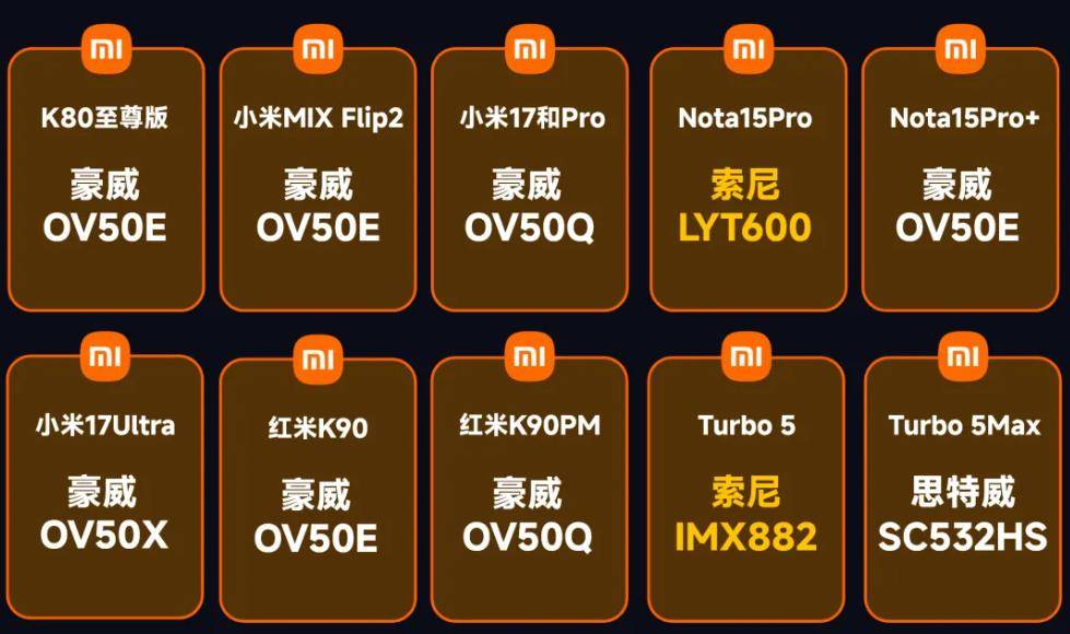 而小米,在小米17系列、K80至尊版系列,Note15 Pro系列,红米K90等等上面,都是大量使用豪威的CMOS芯片,几乎就不怎么使用索尼、三星的CMOS芯片了,清一色的国产。