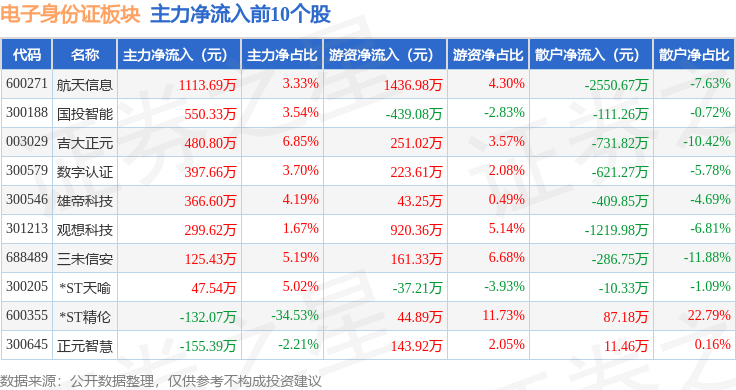 从资金流向上来看,当日电子身份证板块主力资金净流出2.22亿元,游资资金净流入1.19亿元,散户资金净流入1.03亿元。电子身份证板块个股资金流向见下表:
