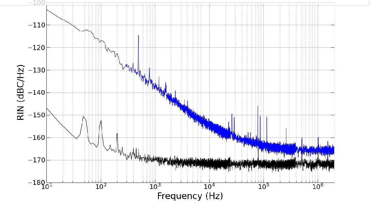 以1310纳米分布式反馈AeroDIODE激光二极管的相对强度噪声(RIN)测量为例:该激光器搭载了AeroDIODE超低噪声驱动电路与AeroDIODE光电探测器。结合标准噪声分析仪使用此款探测器,可实现低至-175 dBc/Hz的本底噪声水平。采用本系列硅光电探测器亦可获得类似优异的测试结果。