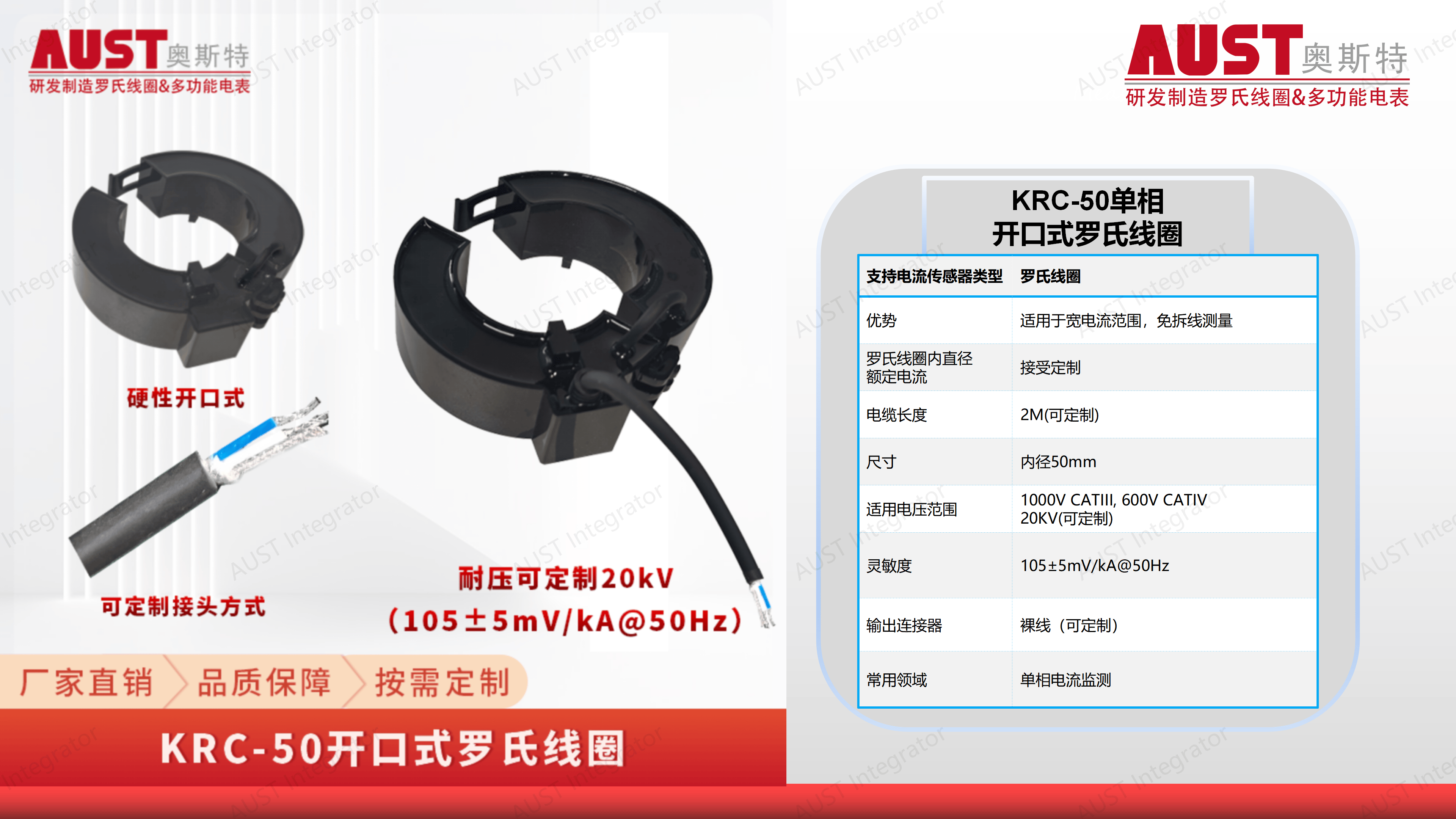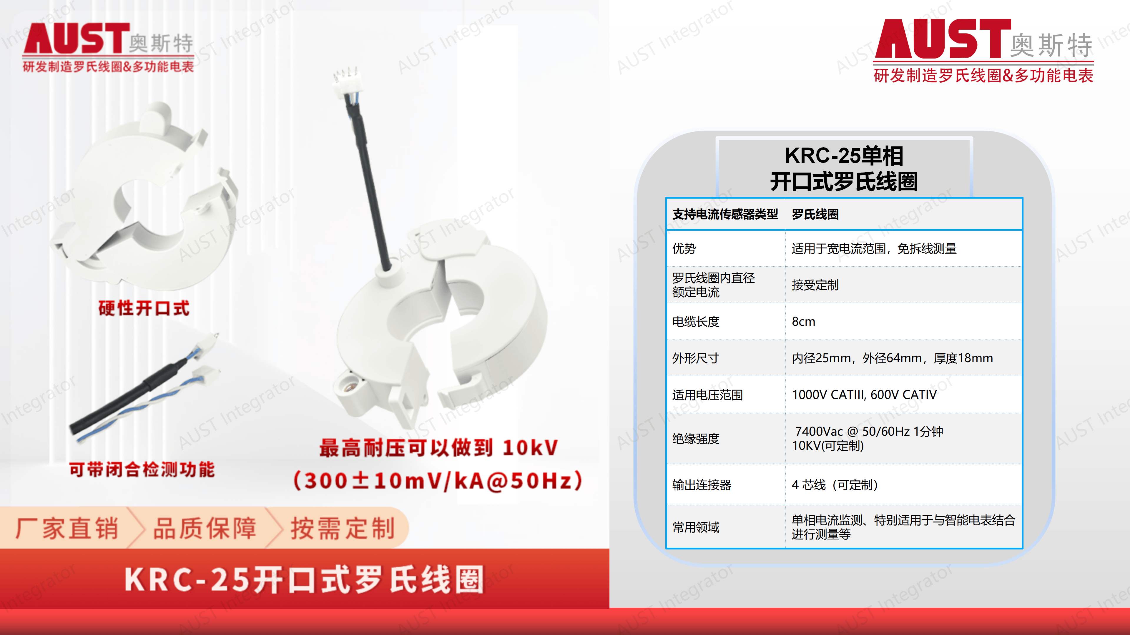 KRC-25 Φ25开口式罗氏线圈(带闭合检测功能) KRC系列是新一代的开口式硬质罗氏线圈(Rogowski® coil)电流传感器,特别适用于与智能电表结合进行测量。KRC线圈灵敏度较大,并强化了屏蔽层,大幅降低了受外部干扰;可以直接接入支持罗氏线圈的表计,而不需要外部积分器。KRC系列线圈具有IP67防护等级,极其适合户外使用。最高耐压可以做到10kV。