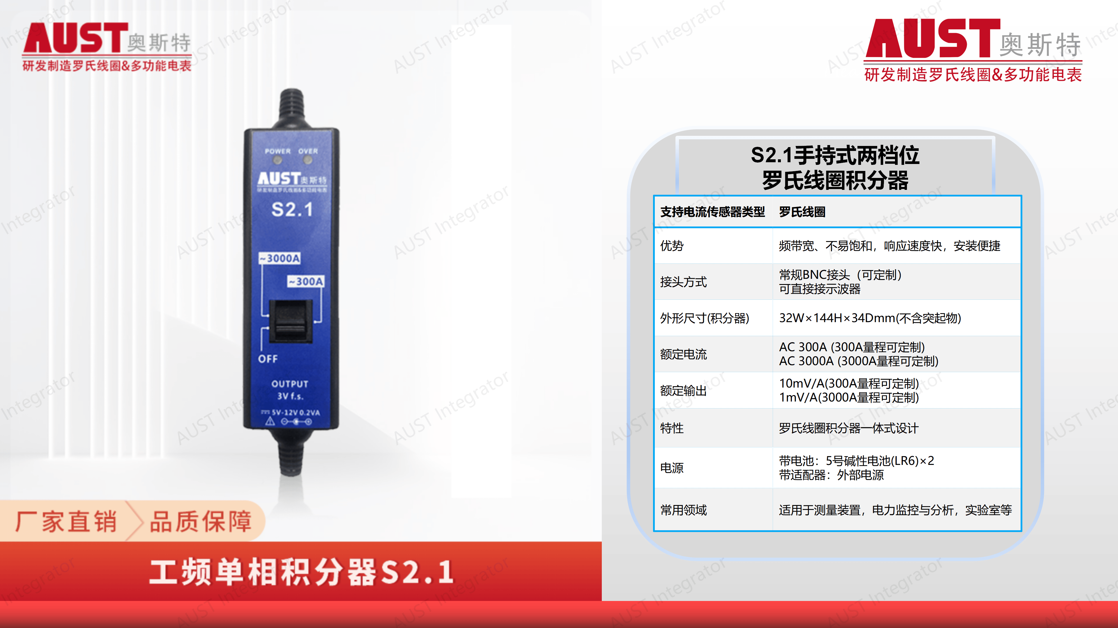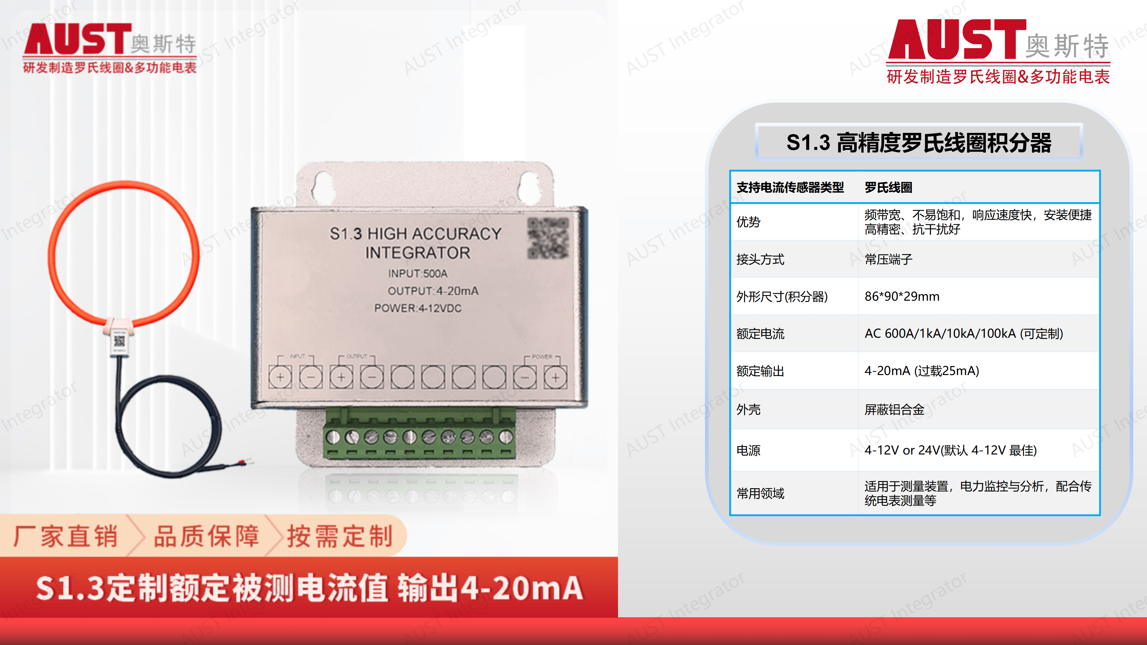 S1.1高精度电压输出积分器 S1是一种带精密屏蔽铝合金外壳的高精度罗氏线圈积分器,内置低波纹 DC 电源模块。 特征 1)S1 可以与任何型号和尺寸的 Y-FCT,NCT,ZRC 等系列的罗氏线圈配合使用; 2)可以根据客户要求,定制额定被测电流值; 3)输出值为:0-10VDC,0-10V 峰值,4-20mA; 4)零漂低至 1.5mV; 5)高带宽测量 30 至 20kHz; 6)S1 和罗氏线圈是一个非常灵活的系统,适用于测量装置,电力监控与分析,配合传统电表测量等。