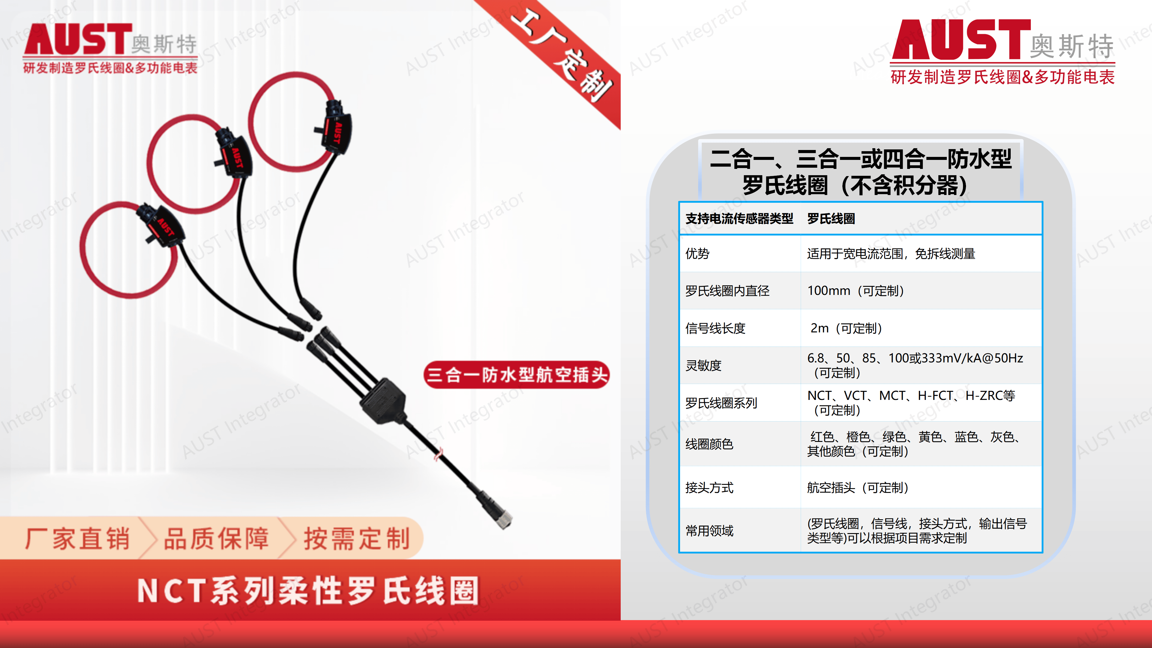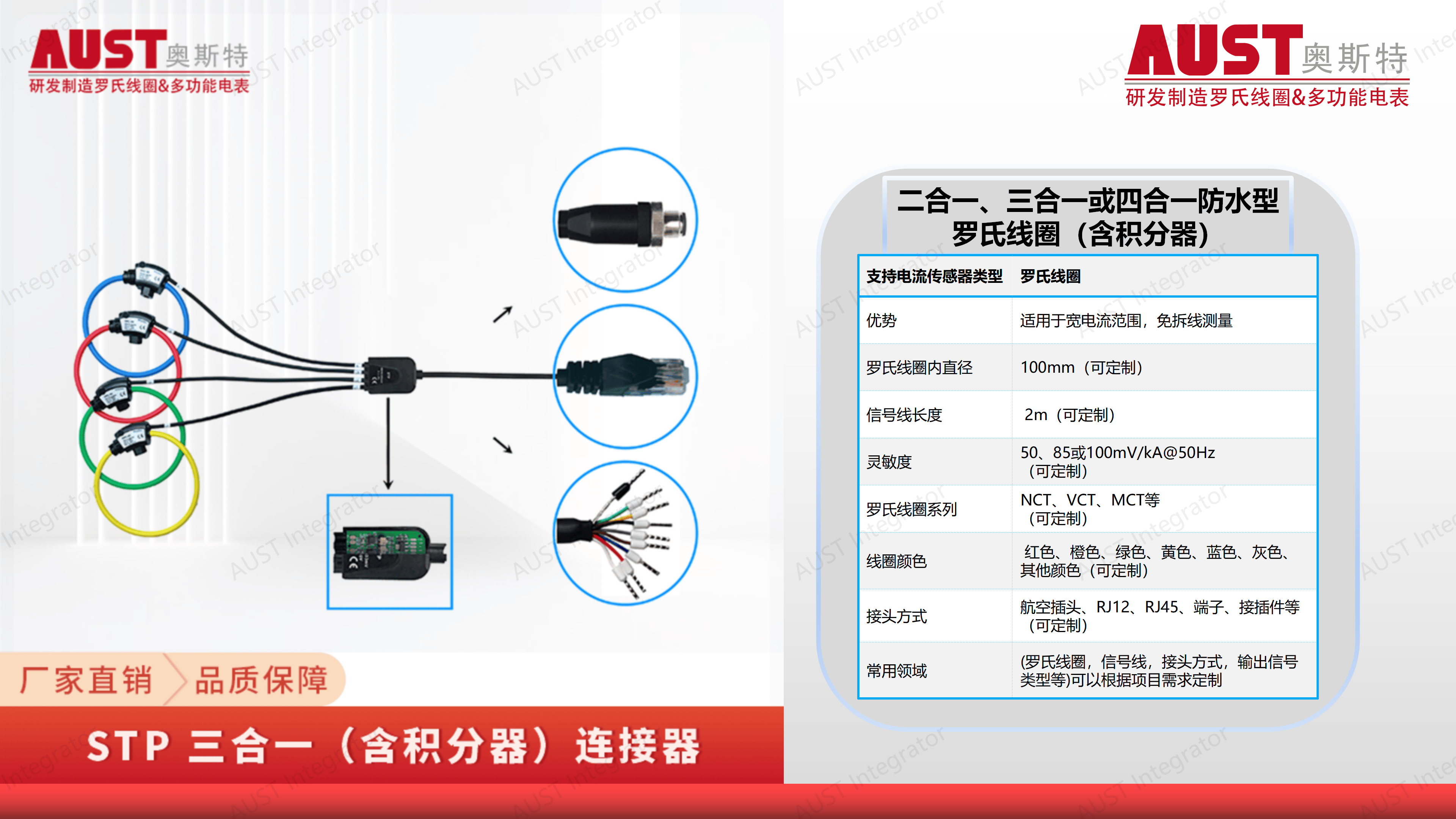 罗氏线圈三合一 防水接头 系列 罗氏线圈三合一 防水接头 三合一防水积分器,防水设计适合户外使用,精度等级为0.5S级,可以以直接接入我司多功能电表和电能质量分析仪等仪器仪表,也可接入我司不同类型的积分器输出需要的各种信号。