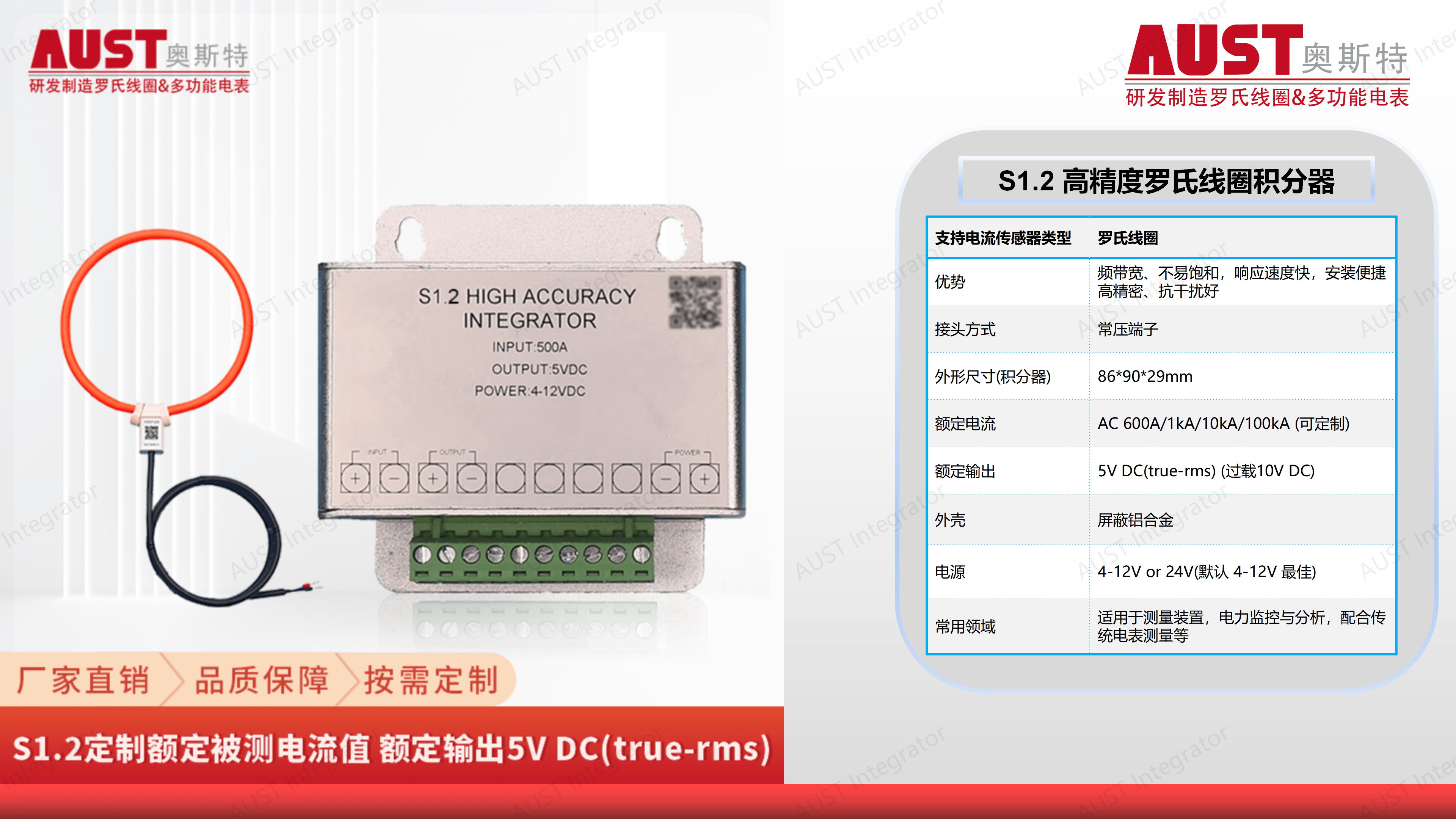 S1.2高精度电压输出积分器 S1是一种带精密屏蔽铝合金外壳的高精度罗氏线圈积分器,内置低波纹 DC 电源模块。 特征 1)S1 可以与任何型号和尺寸的 Y-FCT,NCT,ZRC 等系列的罗氏线圈配合使用; 2)可以根据客户要求,定制额定被测电流值; 3)输出值为:0-10VDC,0-10V 峰值,4-20mA; 4)零漂低至 1.5mV; 5)高带宽测量 30 至 20kHz; 6)S1 和罗氏线圈是一个非常灵活的系统,适用于测量装置,电力监控与分析,配合传统电表测量等。