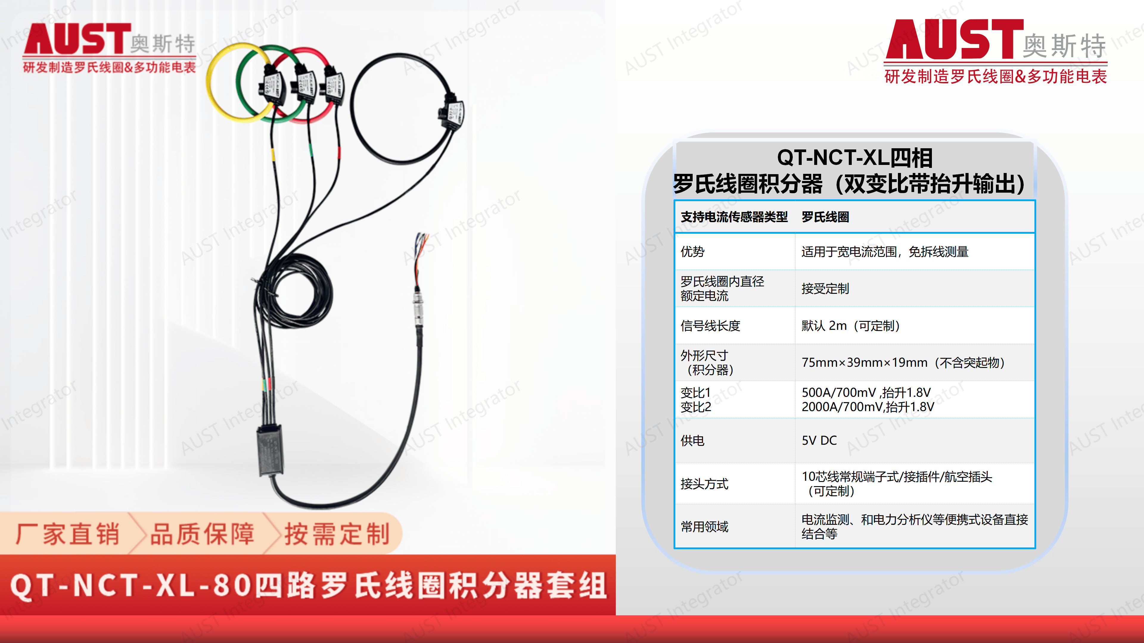 QT-NCT-XL-80四路罗氏线圈积分器套组 四路罗氏线圈积分器套组(带双变比带抬升输出) 柔性电流传感器,可以和电力分析仪等便携式设备直接结合。罗氏线圈额定电流Ia为500A,Ib为500A,Ic为500A,线圈一次侧电流、二次侧电压默认对应关系为带积分器的推荐规格为500A/700mV并抬升1.8V输出,罗氏线圈额定电流In为2000A,线圈一次侧电流、二次侧电压默认对应关系为带积分器的推荐规格为2000A/700mV并抬升1.8V输出,满足于计量箱的需求。