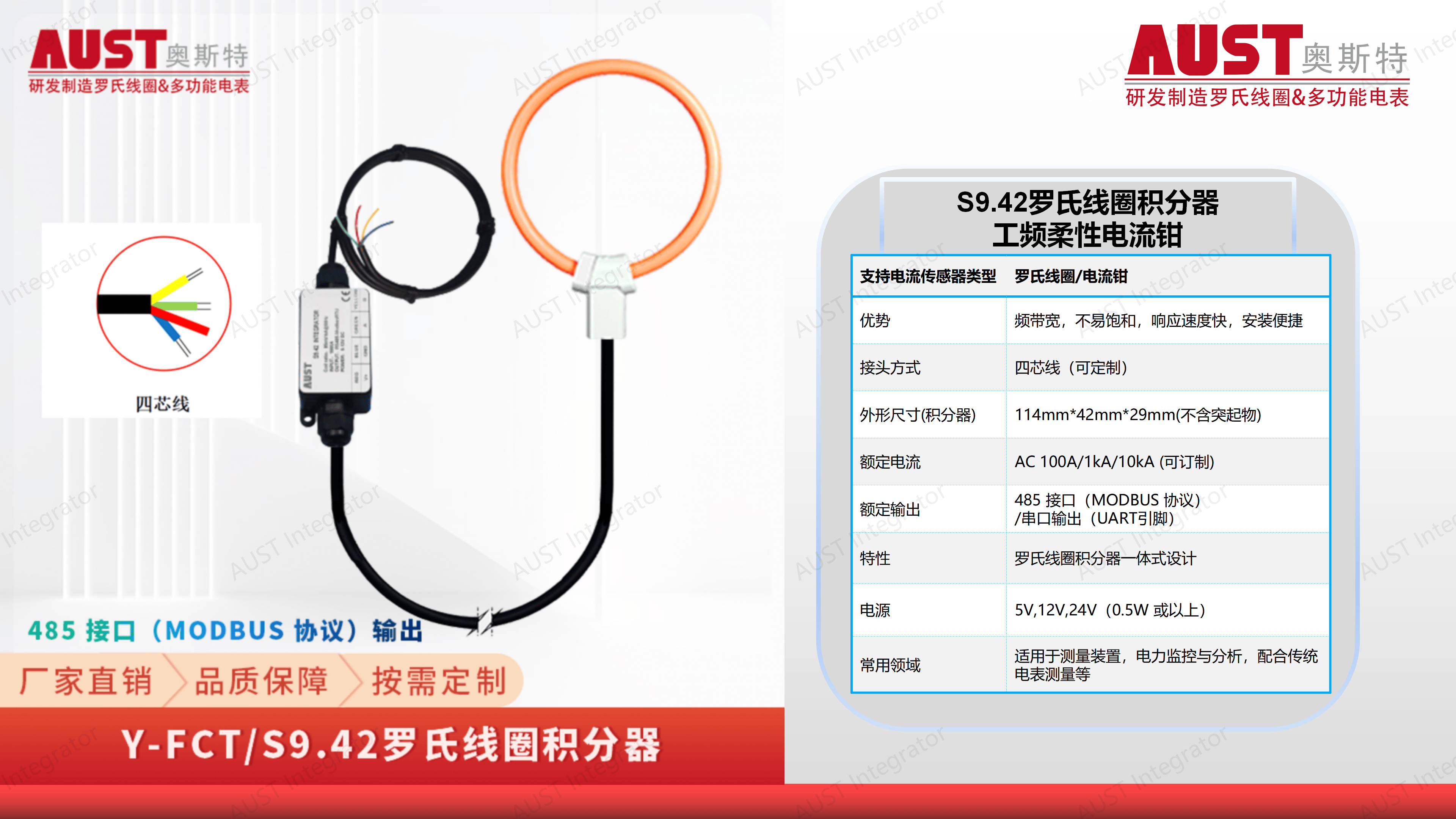 S9.42 是一款内置模拟积分电路,真有效值计算,并转换成 485 接口(MODBUS 协议)输出的积分器。由 5V,12V 或者 24VDC 供电,整体 IP66 防水等级。 1)S9.42 可以与任何型号和尺寸的 Y-FCT,NRC,ZRC,MRC,TRC 等系列的罗氏线圈配合使用; 2)可以根据客户定制额定被测电流值; 3)输出为 485 接口; 4)高带宽测量 30Hz 至 5kHz; 5)S9.42 和罗氏线圈是一个非常灵活的系统,适用于测量装置,电力监控与分析,配合传统电表测量等