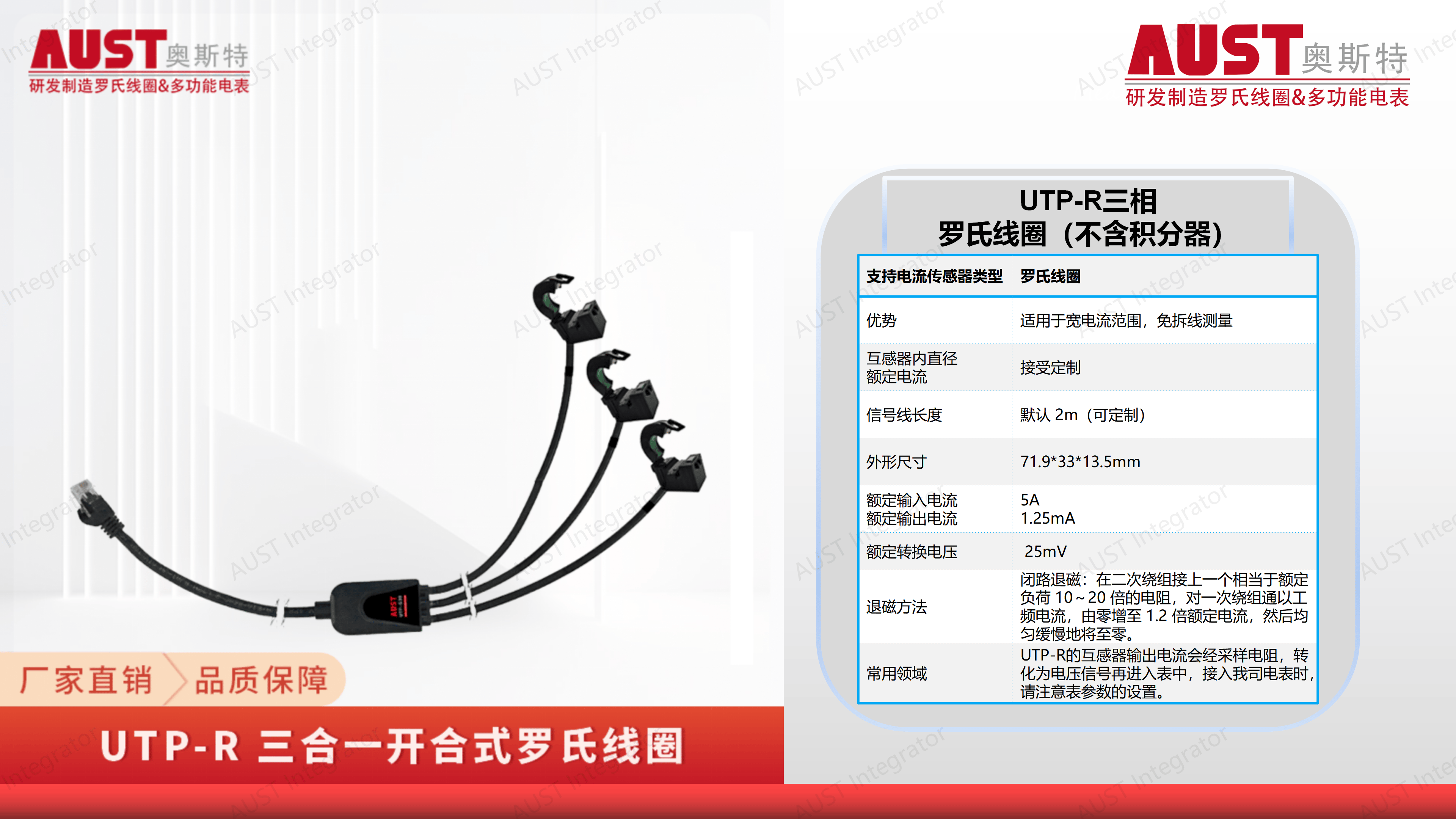 UTP-R 三合一开合式罗氏线圈(不带积分器) UTP-R系列是三合一型的开合式高精度电磁式电流互感器,主要用于小电流测量(额定5A,最大100A)。UTP-R末端为RJ12,只要轻轻插入电表即可使用,安装非常方便,免去了螺丝刀的使用。该电磁式互感器内径16mm,高精度开合式设计,适合电流较小的应用。UTP-R的互感器输出电流会经采样电阻,转化为电压信号再进入表中,接入我司电表时,请注意表参数的设置。