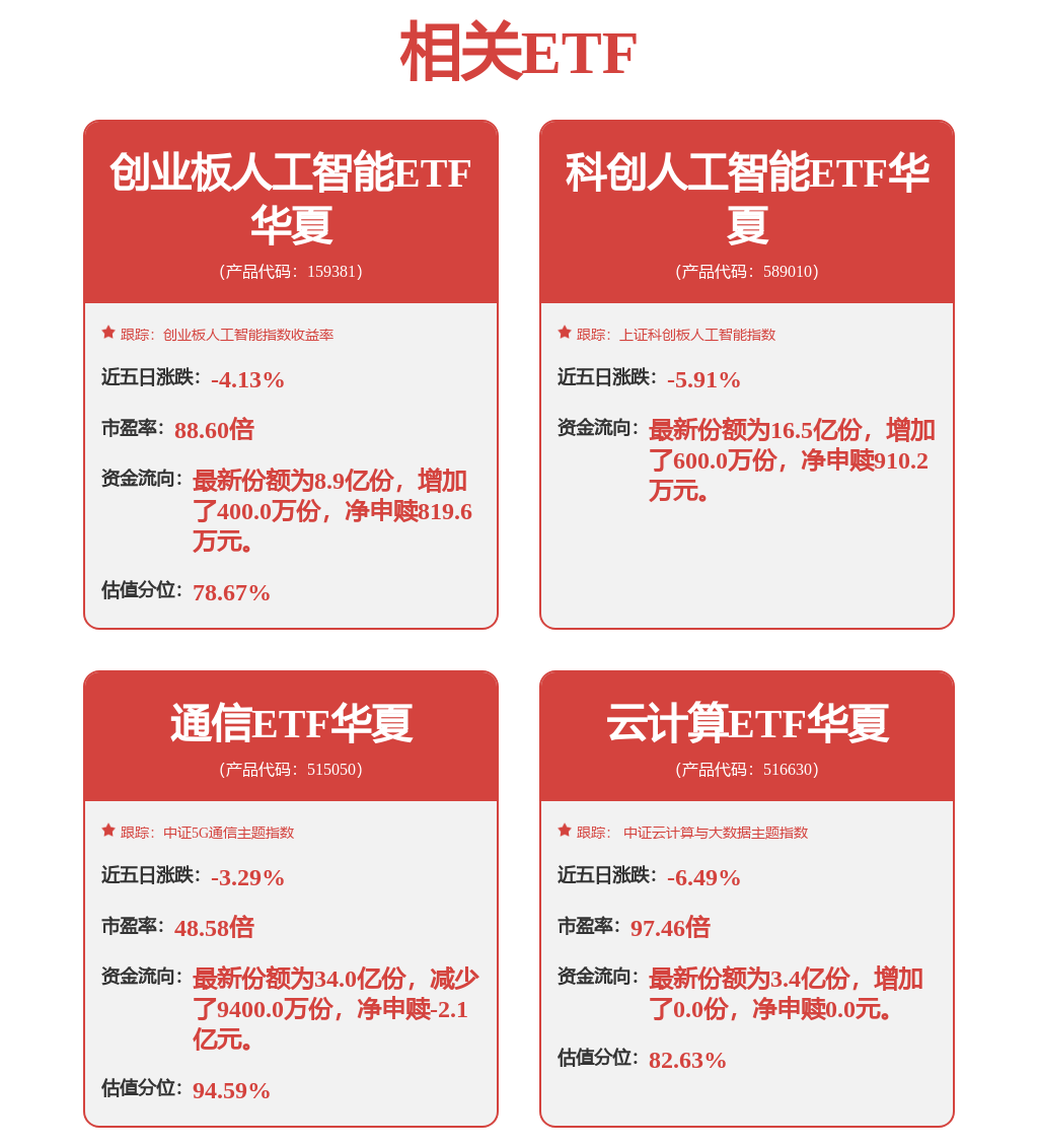 通信ETF华夏(515050)深度聚焦电子(芯片、PCB、消费电子)+通信(光模块、服务器)算力硬件。前五大持仓股:中际旭创、新易盛、立讯精密、工业富联、兆易创新。场外联接(A类:008086;C类:008087);
