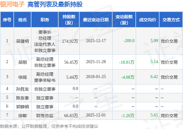 银河电子近半年内的董监高及核心技术人员增减持详情如下: