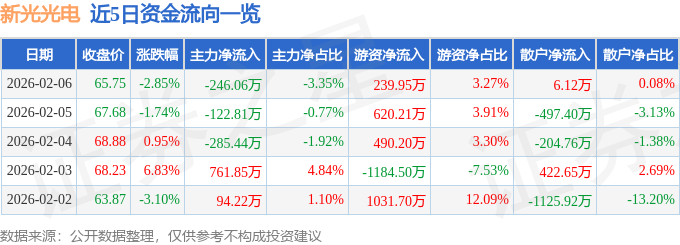 证券之星消息,截至2026年2月6日收盘,新光光电(688011)报收于65.75元,下跌2.85%,换手率1.11%,成交量1.11万手,成交额7339.96万元。