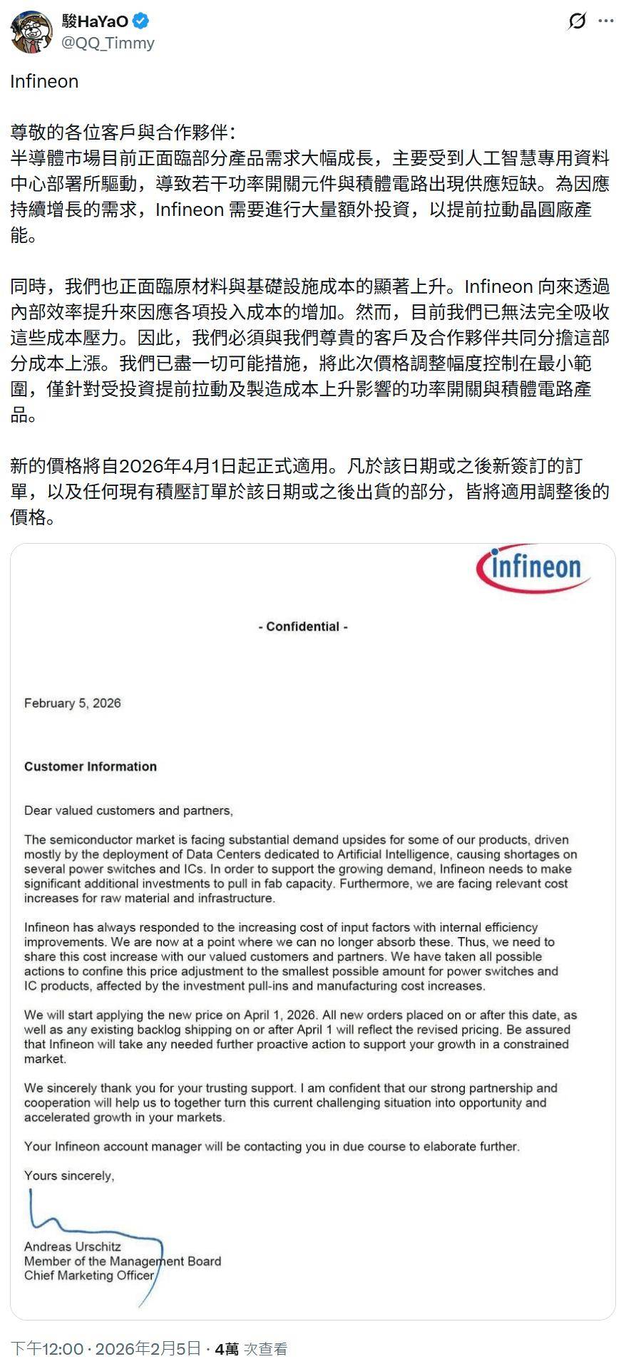 这封信件由英飞凌首席营销官 Andreas Urschitz 签署,他在信中表示,为满足来自人工智能(IT之家注:AI)领域及其他客户需求,英飞凌需要提前扩充产能,因此公司不得不从 4 月 1 日起调整电源开关 / IC 元件的价格,当天 / 之后下达的新订单及任何当日或之后发货的积压订单都将按照调整后价格执行。