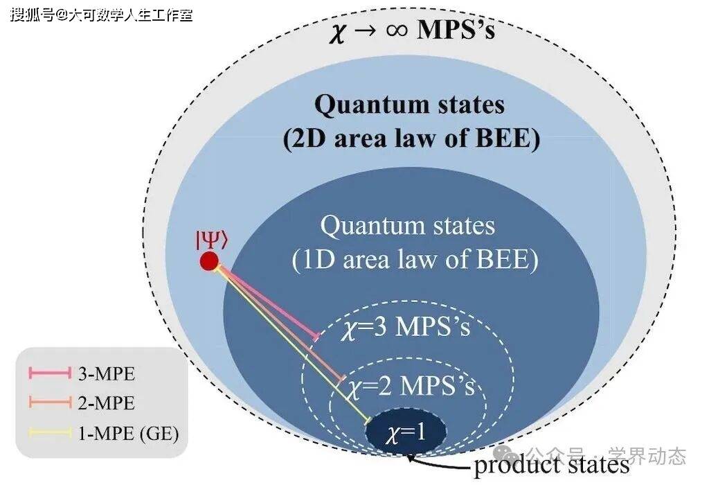 当χ=1时,MPS退化成了最简单的“乘积态”,这时χ-MPE就变成了人们熟悉的“几何纠缠”,它衡量的是与完全没有纠缠的状态间的距离。