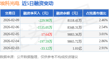 证券之星消息,2月9日,埃科光电(688610)融资买入965.63万元,融资偿还1195.53万元,融资净卖出229.9万元,融资余额8118.41万元。