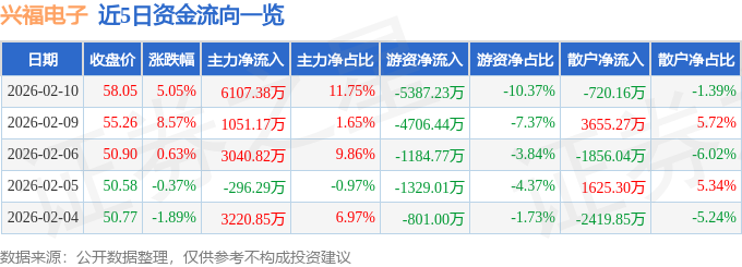 证券之星消息,截至2026年2月10日收盘,兴福电子(688545)报收于58.05元,上涨5.05%,换手率4.95%,成交量9.03万手,成交额5.2亿元。