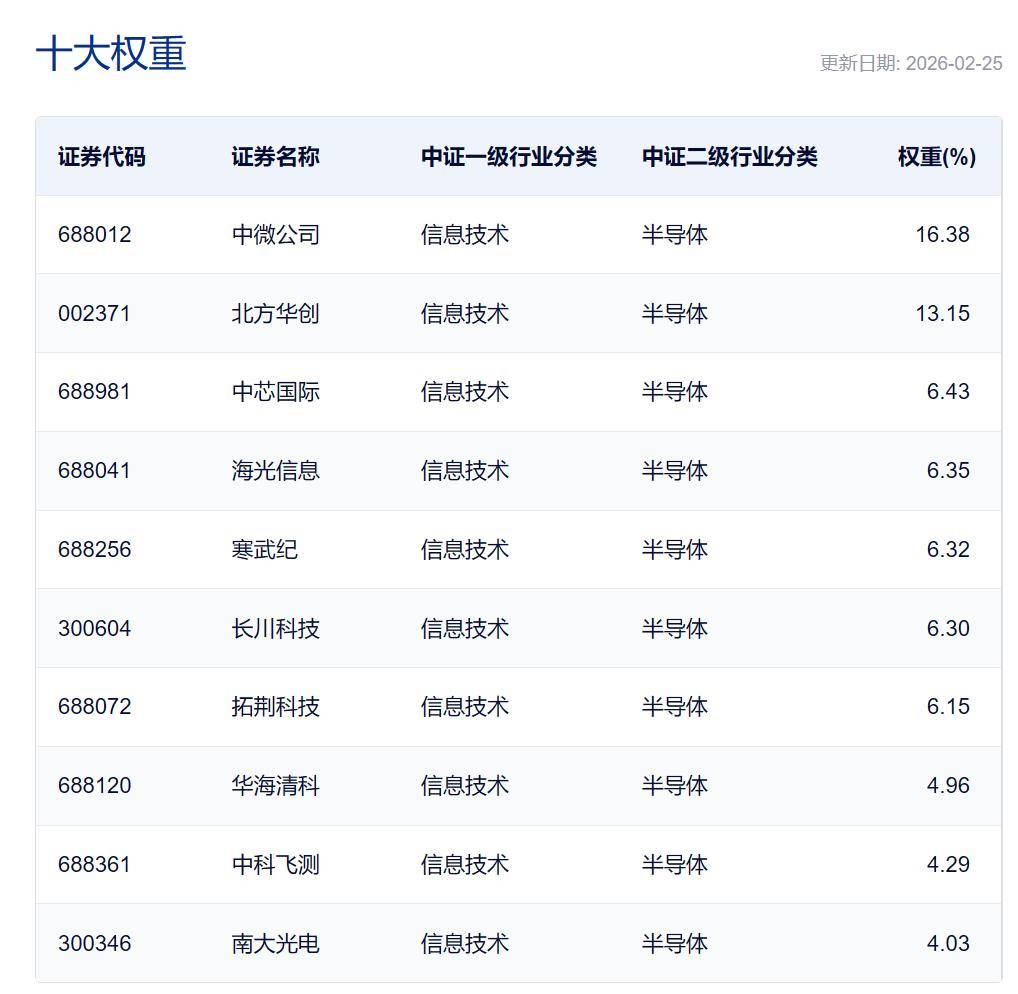 这个ETF虽然名字是半导体设备,但是跟踪的却是中证半导体产业指数,对半导体设备、材料和设计都有布局,比如北方华创、中微公司、寒武纪、海光信息、沪硅产业、南大光电都是前十大,三个行业占比超过90%。指数剩余权重布局的还有集成电路制造,代表权重股是中芯国际,全是半导体核心龙头,含金量很高。