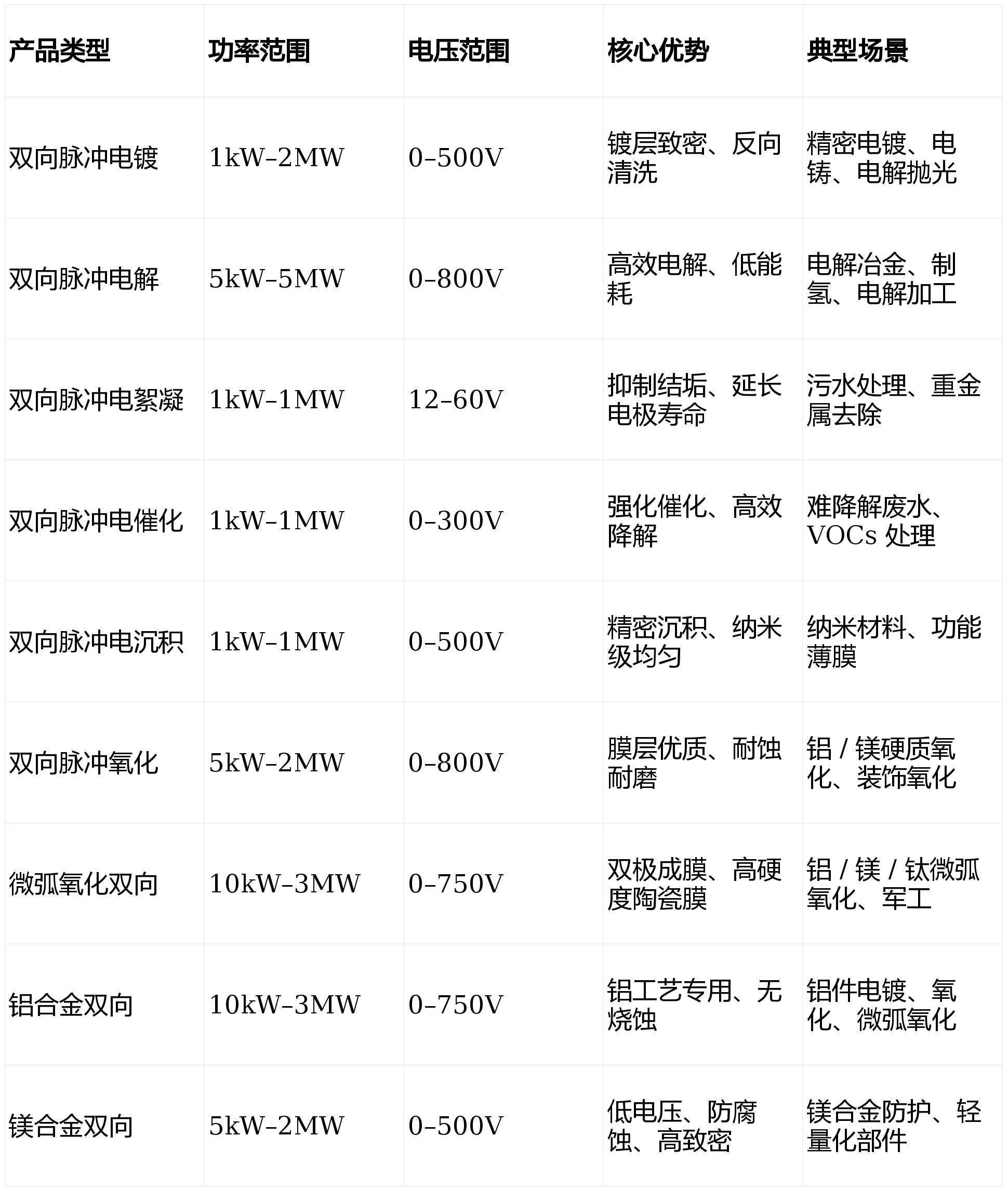 - 参数:功率 5kW–2MW,电压 0–500V,正负脉冲独立控制