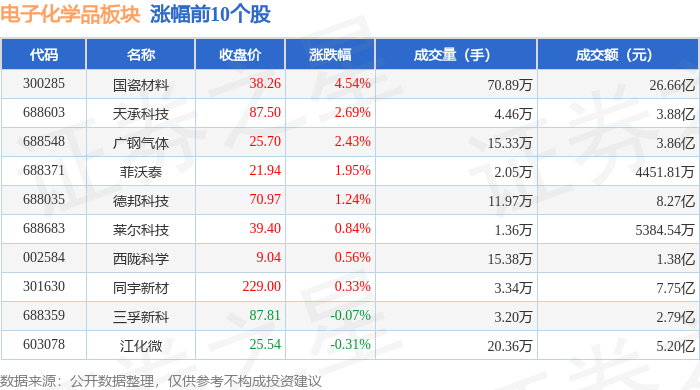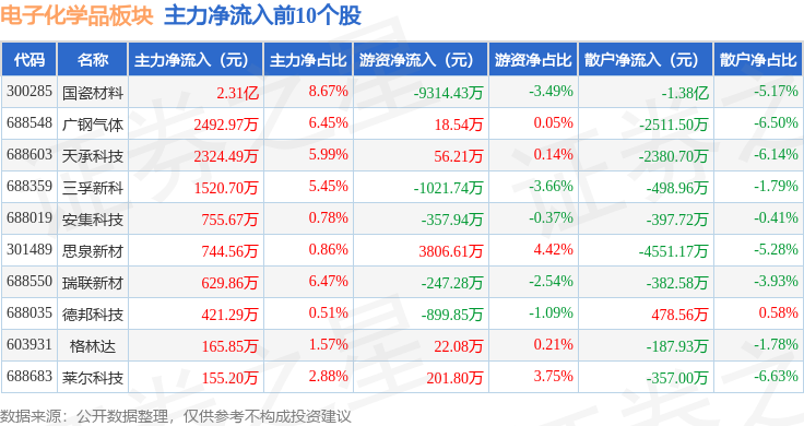 从资金流向上来看,当日电子化学品板块主力资金净流出10.47亿元,游资资金净流入3.25亿元,散户资金净流入7.22亿元。电子化学品板块个股资金流向见下表: