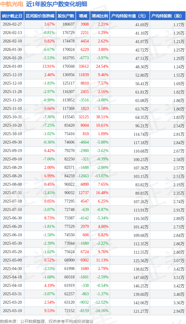 从股价来看,2026年2月13日至2026年2月27日,中航光电区间涨幅为3.67%,在此期间股东户数增加3908.0户,增幅为2.21%。