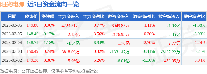 证券之星消息,截至2026年3月6日收盘,阳光电源(300274)报收于149.8元,上涨0.9%,换手率2.29%,成交量36.46万手,成交额54.57亿元。