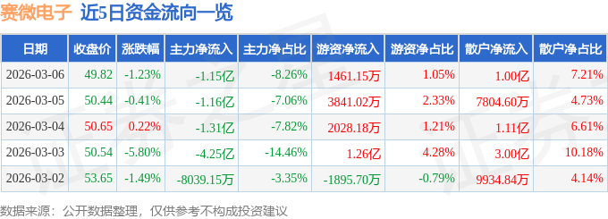 证券之星消息,截至2026年3月6日收盘,赛微电子(300456)报收于49.82元,下跌1.23%,换手率4.66%,成交量27.87万手,成交额13.93亿元。