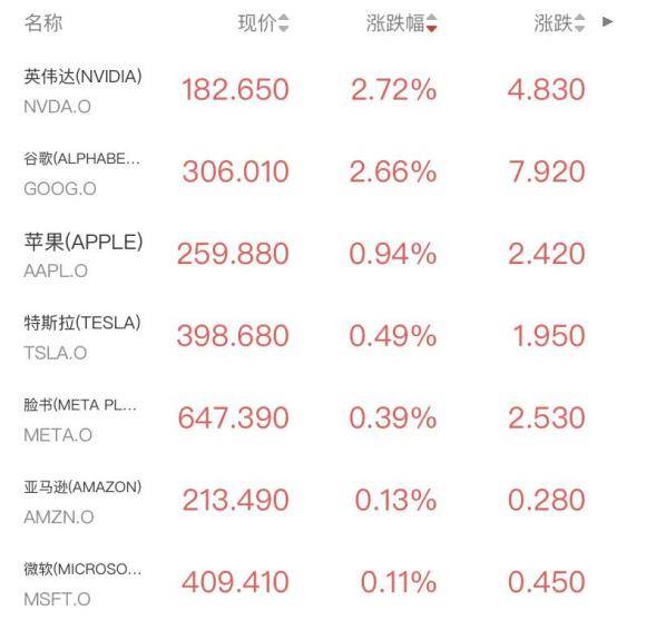 明星科技股普涨,谷歌涨2.66%,苹果涨0.94%,特斯拉涨0.49%,Meta涨0.39%,亚马逊和微软涨逾0.1%。