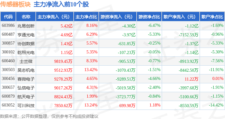 从资金流向上来看,当日传感器板块主力资金净流入17.13亿元,游资资金净流出13.42亿元,散户资金净流出3.71亿元。传感器板块个股资金流向见下表: