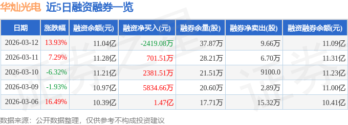 证券之星消息,截至2026年3月12日收盘,华灿光电(300323)报收于13.41元,上涨13.93%,换手率32.4%,成交量284.9万手,成交额37.31亿元。