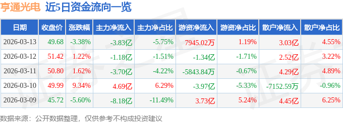 证券之星消息,截至2026年3月13日收盘,亨通光电(600487)报收于49.68元,下跌3.38%,换手率5.35%,成交量130.78万手,成交额66.61亿元。