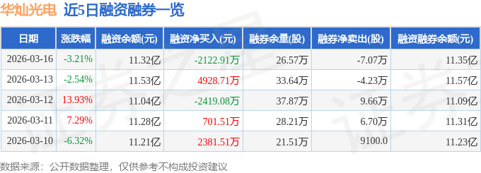 证券之星消息,截至2026年3月16日收盘,华灿光电(300323)报收于12.65元,下跌3.21%,换手率17.71%,成交量155.75万手,成交额19.47亿元。