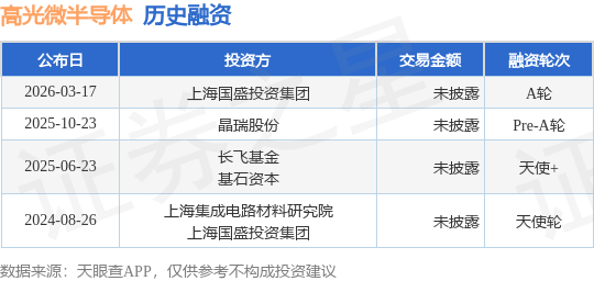 证券之星消息,根据天眼查APP于3月17日公布的信息整理,上海高光微半导体科技有限公司A轮融资,融资额未披露,参与投资的机构包括上海国盛投资集团。
